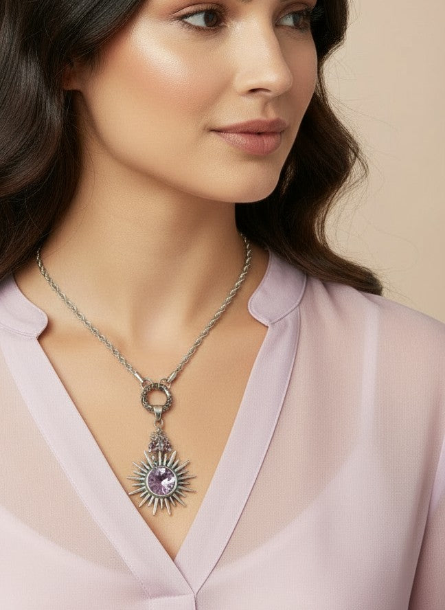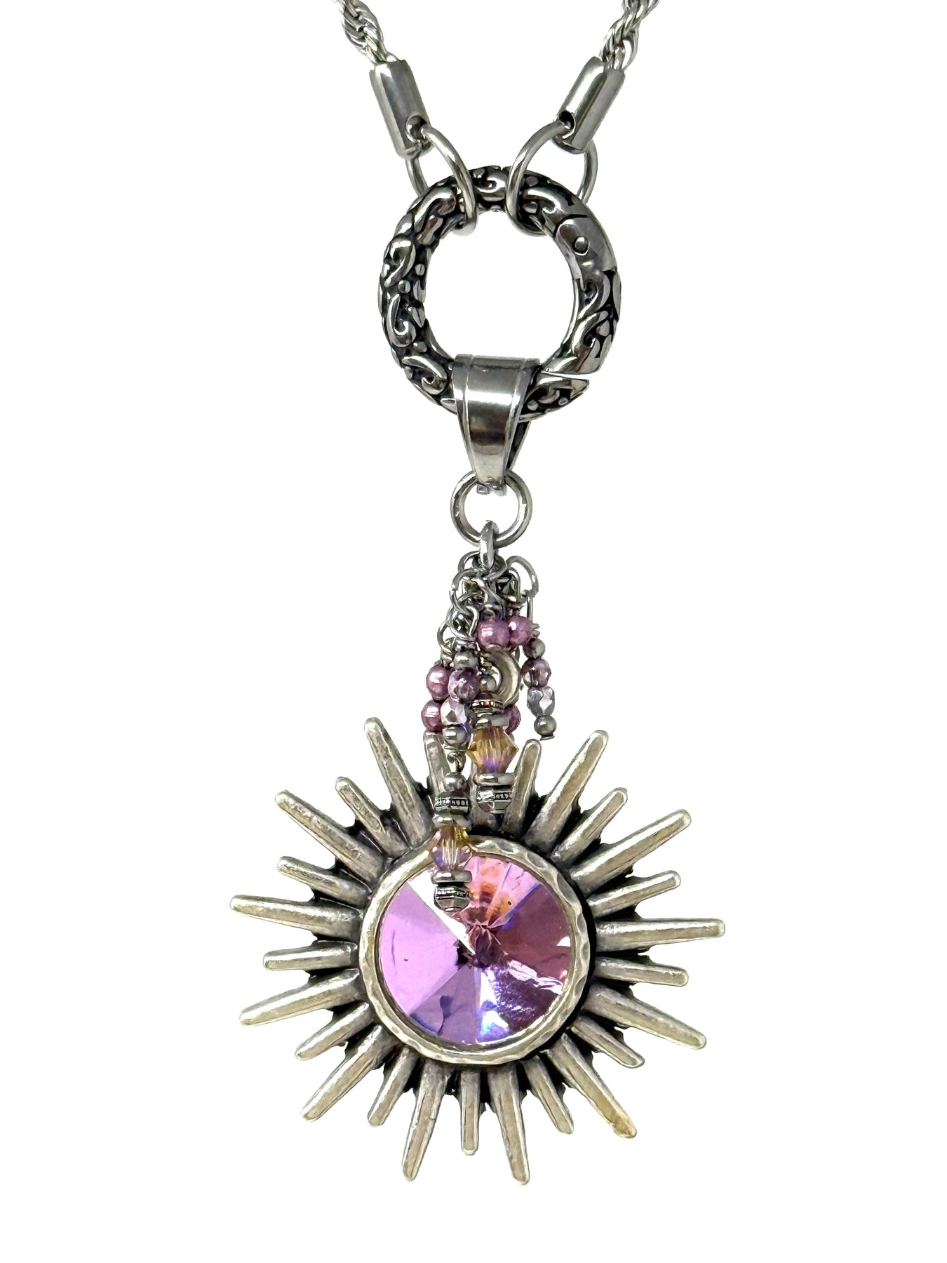 Silver sun pendant with a pink crystal gemstone, with hanging crystals