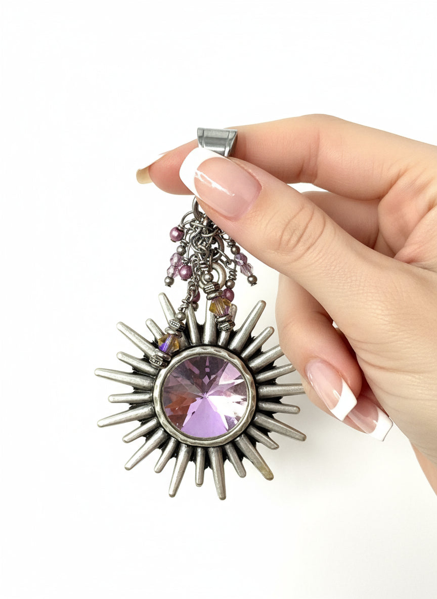 "This pink crystal sun pendant is so cheerful and uplifting! The sun design is perfectly formed and the pink crystals sparkle beautifully in the light. It's become my go-to pendant when I want to feel happy and energized. The beadwork is so intricate and the pink tones are soft and feminine without being too sweet."
