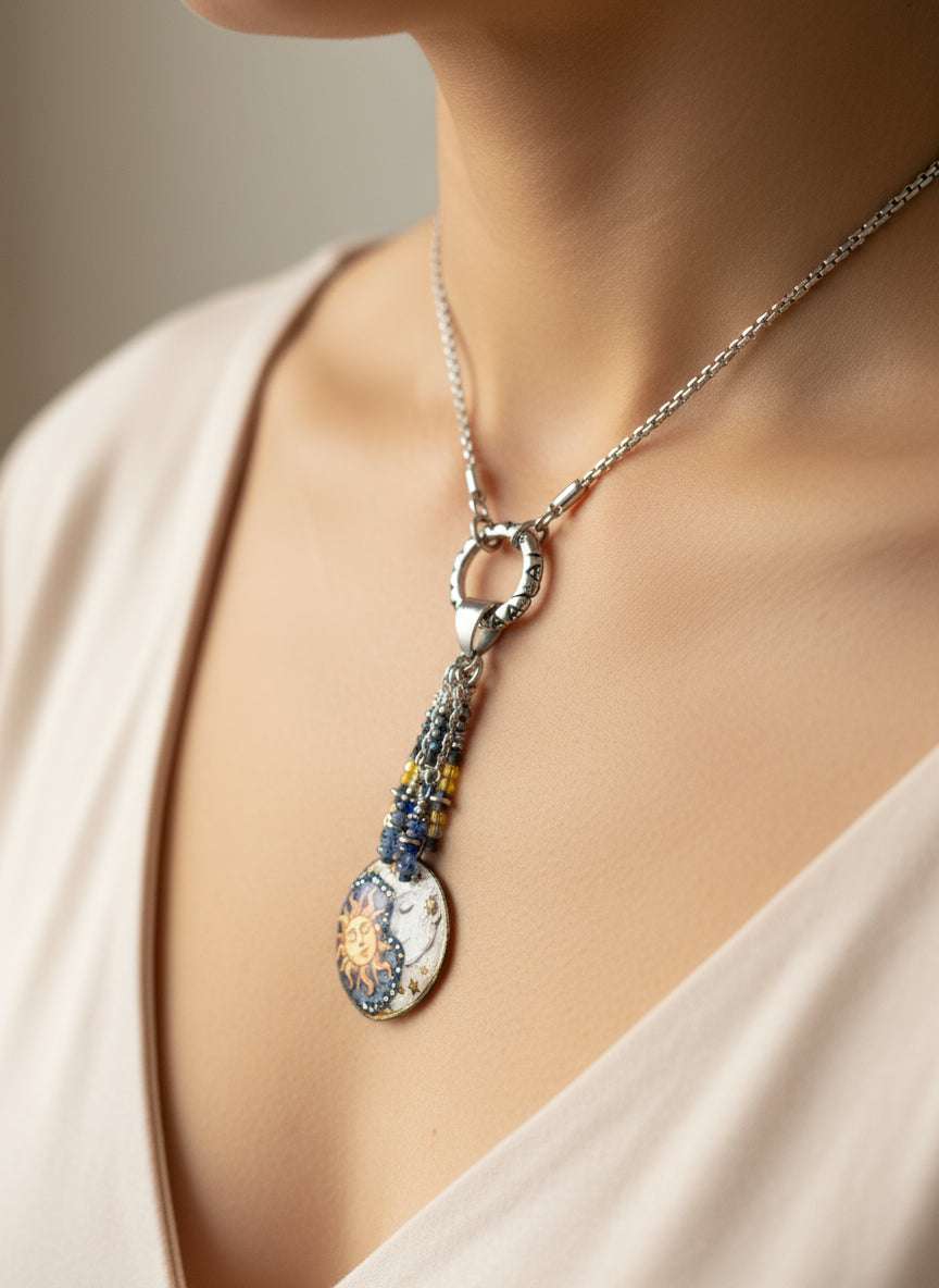 A true testament to fine craftsmanship, this striking Porcelain Sun and Moon Dangle Pendant is a stunning, multi-color work of wearable art. It features a genuine Porcelain Sun and Moon Focal Bead complemented by delicate dangle beads that add texture and depth.