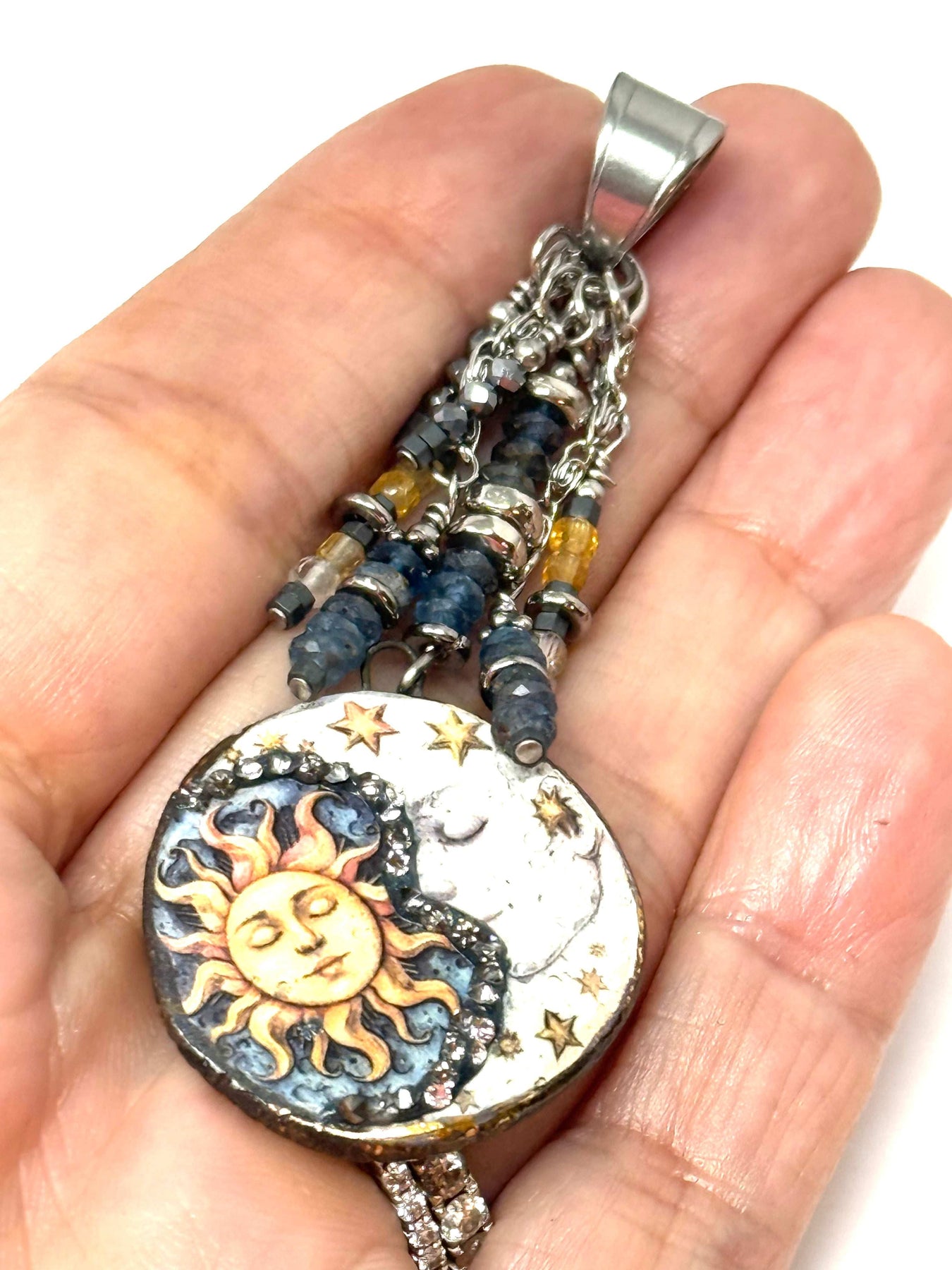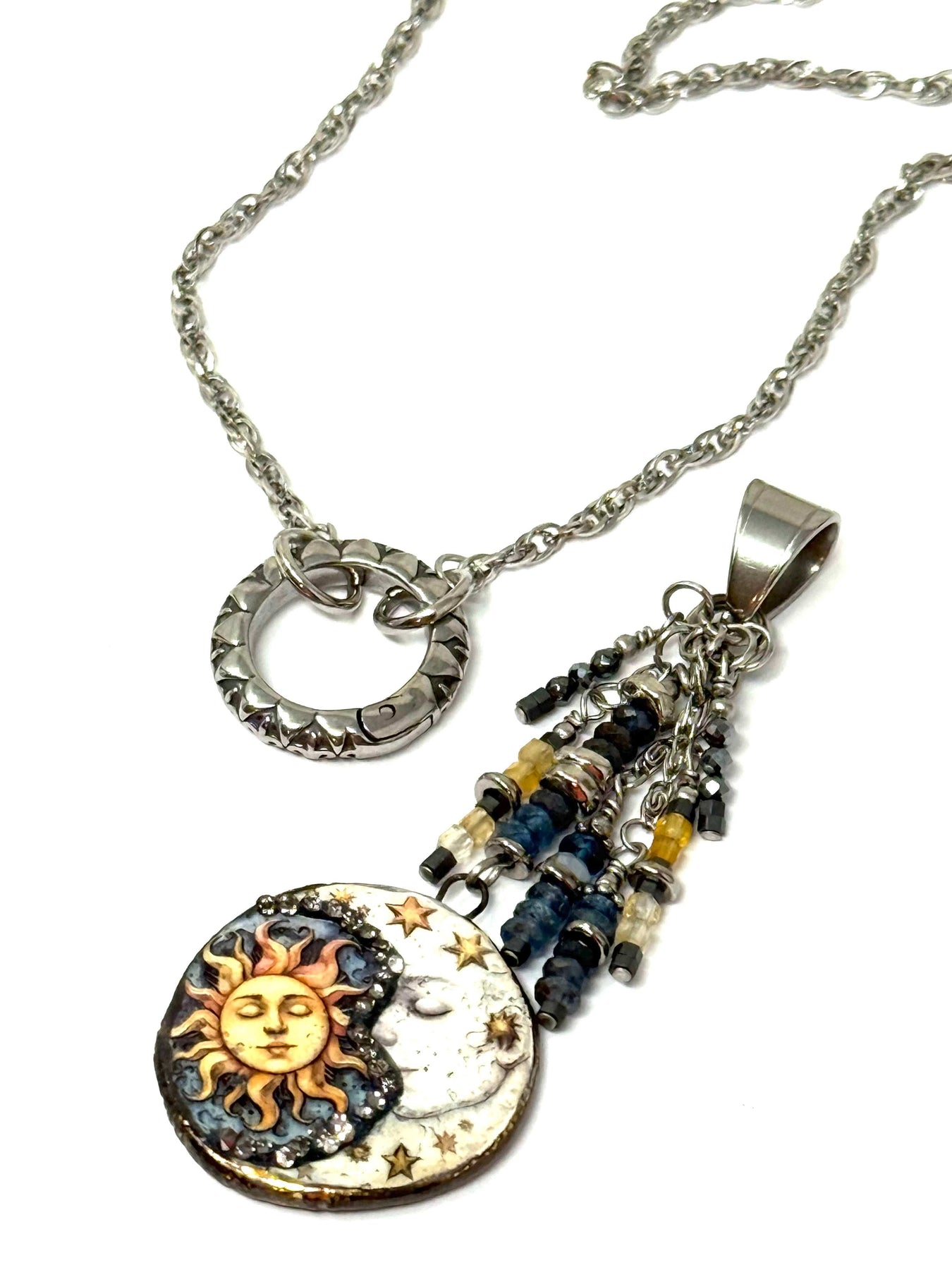 Sun and Moon Pendant Porcelain Dangle - Handmade Beaded Necklace #8173D