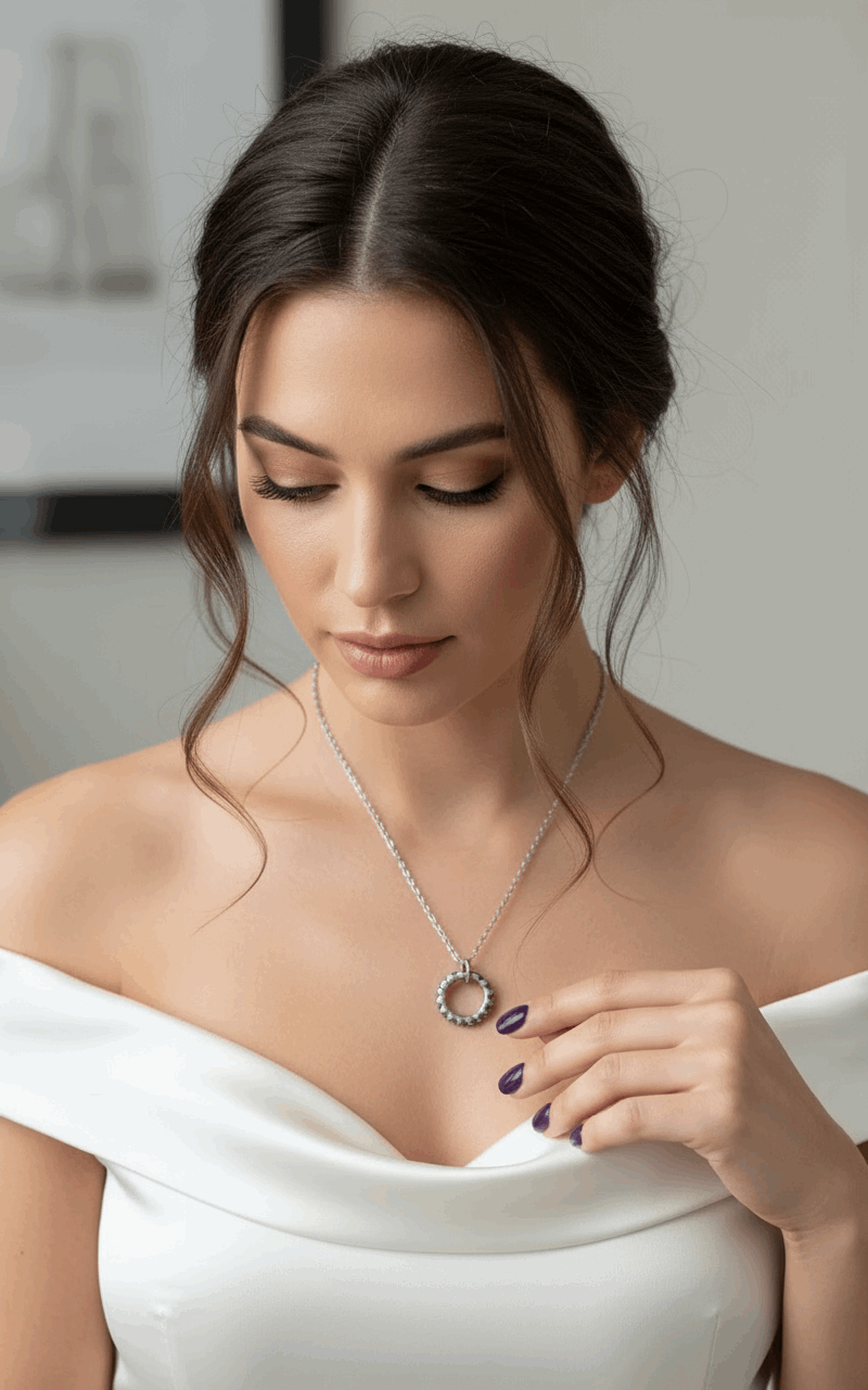 Close-up of the stainless steel O-ring hinge clasp for the lace chain necklace, held between two fingers.