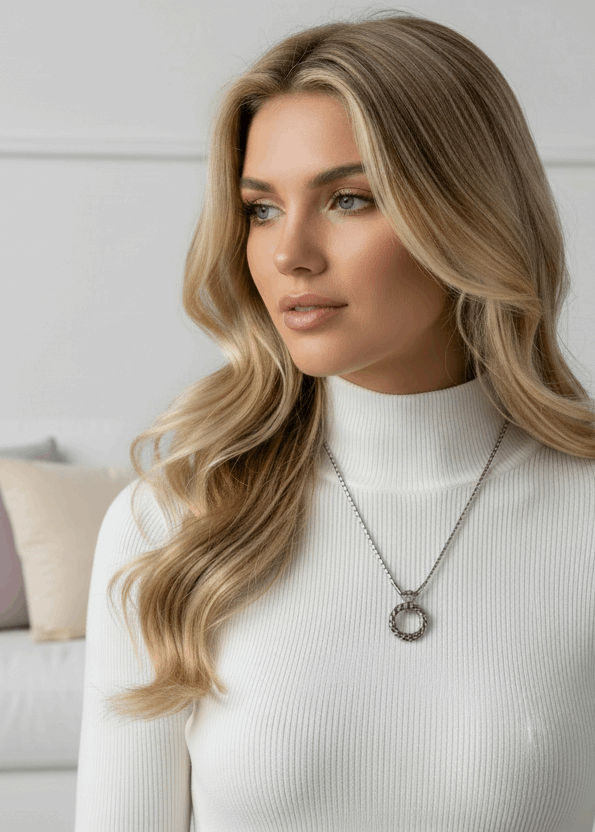 "This Coreana chain is absolutely stunning! The unique weave pattern is so elegant and different from any chain I've ever owned—it looks like fine jewelry from a high-end boutique. I love that I can change my pendants in seconds without struggling with tiny clasps. I have limited dexterity, and this chain has made wearing my beautiful pendants so much easier. The texture catches the light beautifully and looks gorgeous with everything from casual to formal outfits. I've purchased it in multiple lengths because I love it so much. This is hands-down the most stylish and functional chain I own!"