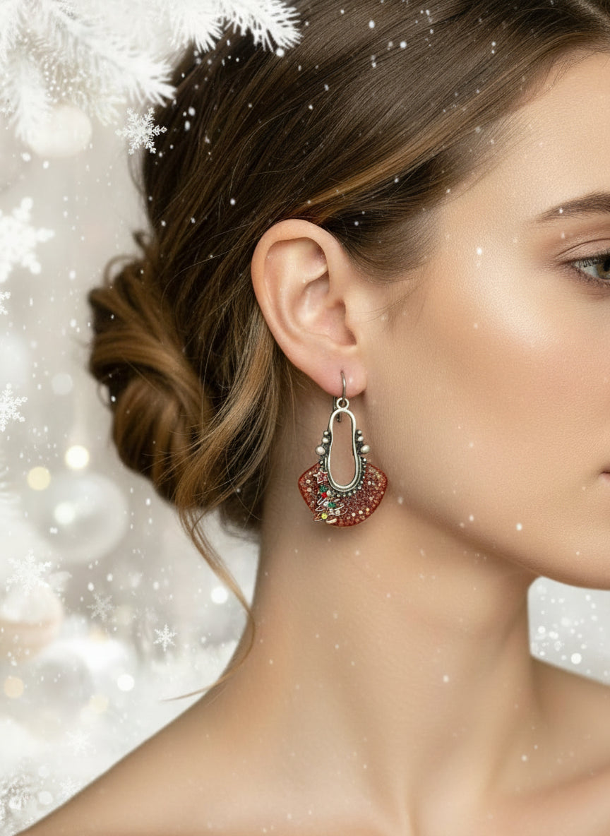 • Design: Long dangle earrings featuring handcrafted Christmas trees with red glitter and embedded stars and crystals in gold, green, and red