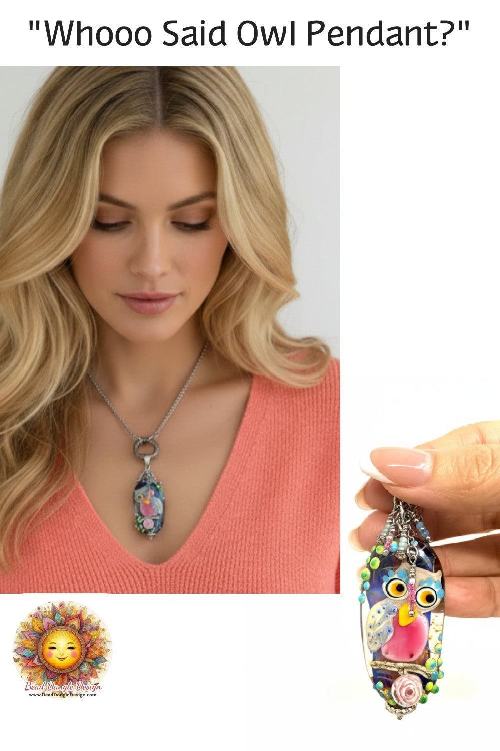 Focal Bead: Features a chunky handmade lampwork glass owl bead with pink body, yellow beak, turquoise blue and lime green accents, and expressive eyes