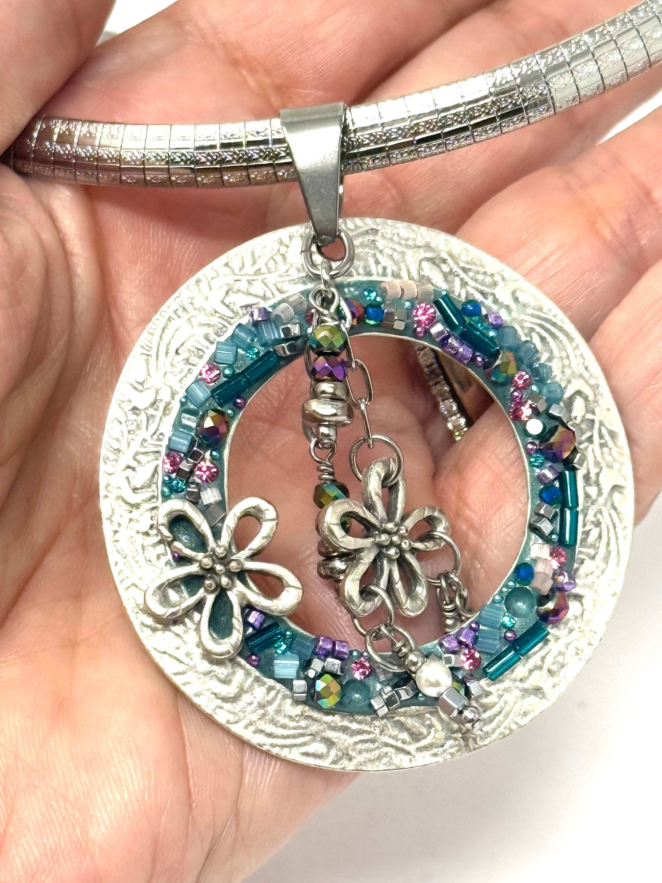Hand holding a decorative silver pendant with colorful beads and flower accents on a thick chain.